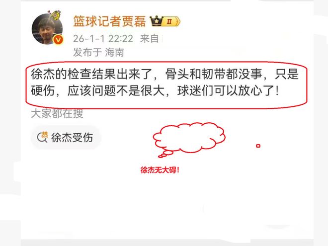 看到如此多球迷支持自己,徐杰也是很感动,十分欣慰,为了不让球迷担忧,徐杰还反过来安慰球迷:不要紧的,下一场比赛我还能打!