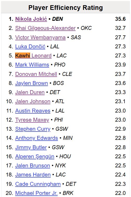 以及,伦纳德的最新PER值已经达到了27.3分,这个数字目前排在联盟第五,并且也是伦纳德的生涯最高——此前最高是2016-17赛季,那一年伦纳德带领马刺拿了60+,个人在MVP和DPOY榜上全部排在第三,PER值达到了27.6。