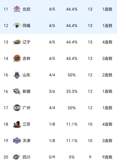 此外,昔日总冠军辽宁队遭遇一波4连败之后,排名跌至第十,此前一度高居第三位,上赛季常规赛第二的山西队,同样遭遇4连败,不过排名位列第七。