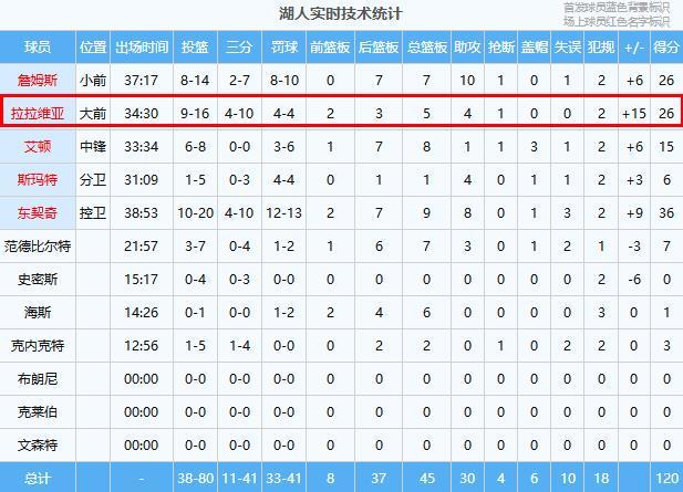 东契奇36分9板8助、詹姆斯26分7板10助、拉拉维亚26分5板4助、艾顿15分8板1助3帽、范德比尔特7分7板3助、斯玛特6分1板4助、克内克特3分2板、海斯1分6板