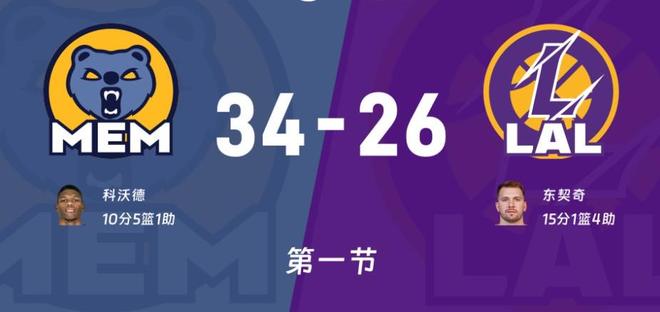 范德彪换下詹姆斯,东契奇单打韦尔斯中距离还有,今天进攻感觉不错。阿尔达玛抛投不中,东契奇试试三分没有,双方各自失误球权还在灰熊手里,阿尔达玛三分也不中,东契奇突破内线失误,阿尔达玛空位三分还是没有,回过来东契奇突破抛投追成17平。韦尔斯底角空位三分这次把握住了,艾顿造成科洛克打手两罚一中,范德彪抢篮板出现乌龙球,范德彪内线上篮将功补过,东契奇三分飚中帮助湖人23-22反超1分,2分48秒灰熊喊出暂停。比赛继续,詹姆斯重新登场JJ杰克逊三分帮助灰熊止血,东契奇过来就造成GG杰克逊犯规两罚全一中,斯潘塞强投三分不中科沃德抢到前场板补扣得手,范德彪分球失误,GG杰克逊转换三分再中30-24重新领先6分,东契奇、史密斯连续三分打铁,JJ杰克逊到内线单打海斯成功两分钟不到打了一波10-2。首节打完湖人26-34落后8分!