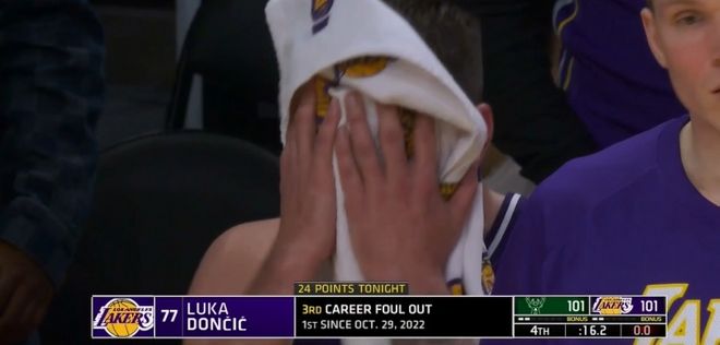 - 东契奇6犯离场细节:怒摔护膝毛巾捂脸 湖人本季首次关键时刻输球