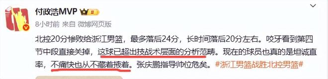 除了CBA前外援琼斯吐槽北控队外,前中国男篮主教练王非和付政浩也批评了北控队,道出了输球的原因。王非说,就本场比赛来讲,抛开技战术层面不说,可以说,北控队最起码需要有一些斗志,如果,连斗志都没有了,那么,谈什么都没有用了。媒体人付政浩说,北控20分惨败给浙江男篮,最多落后24分,长时间落后20分左右。咬牙看到第四节中段直接关掉,这球已超出技战术层面的分析范畴。现在的球员也真的是坦诚直率,不痛快也从不藏着掖着。张庆鹏指导帅位危矣。