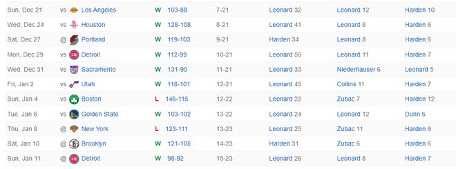 过去的11场比赛快船赢下了其中的9场,快船目前15胜23负距离西部第十的灰熊只差1个胜场,快船又燃起了附加赛的希望,而这一波11战9胜的基本盘就是哈登。