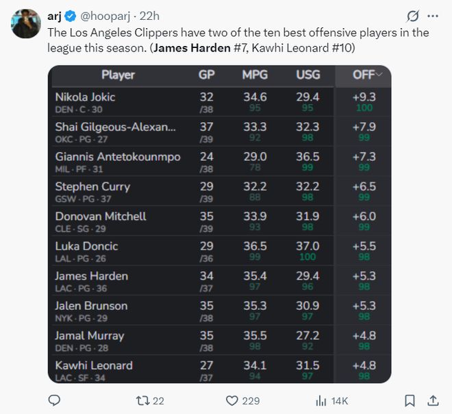 根据美媒的数据,哈登是本赛季联盟进攻第七的超巨,莱昂纳德是本赛季进攻第十的超巨,就连布伦森、贾马尔-穆雷都在哈登之后,值得一提的是前十榜单中只有哈登一人是35岁以上的球员。