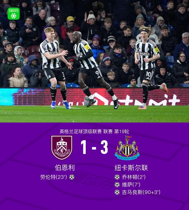 北京时间12月31日,英格兰足球超级联赛第19轮,伯恩利坐镇主场迎战纽卡斯尔联。上半场,乔林顿闪击得分。维萨随后为纽卡扩大领先优势,布罗亚头球摆渡,劳伦特扳回一城。下半场,伯恩利后场失误,吉马良斯吊射破门锁定胜局。全场比赛结束,纽卡3-1击败伯恩利,送给对手十轮不胜。