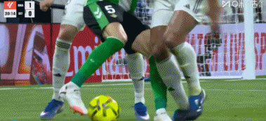 从慢镜头来看,贝林厄姆试图解围但右脚踢在巴尔特拉左脚上,随后右脚连球带人一起踢。