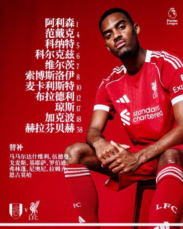 利物浦首发:阿利松/布拉德利、科纳特、范戴克、凯尔凯兹/赫拉芬贝赫、麦卡利斯特/索博斯洛伊、维尔茨(76’弗林蓬)、柯蒂斯·琼斯(85’基耶萨)/哈克波(90+6’乔·戈麦斯)