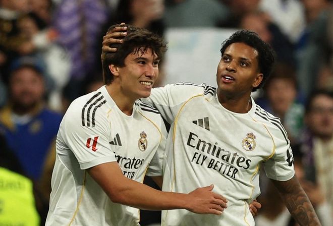 下半场易边再战。第50分钟,贡萨洛-加西亚在禁区外胸部停球后凌空抽射,皮球直接钻入球门左下角。停球射门一气呵成,真是太漂亮了。6分钟后,皇马又进球了!罗德里戈开出角球,劳尔-阿森西奥抢点头球攻门,皮球直挂死角!门将只能眼睁睁看着皮球入网!