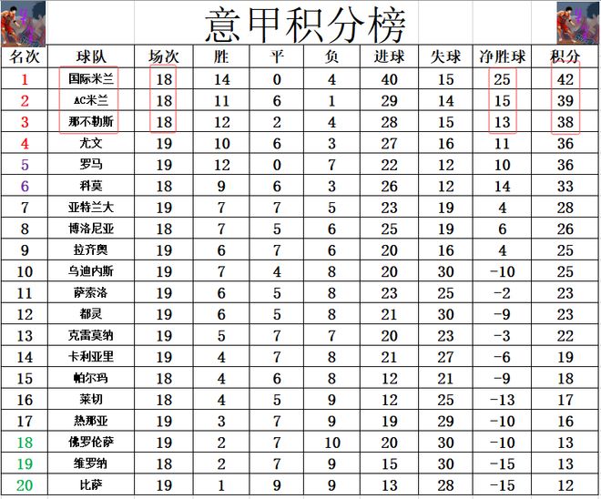 积分榜方面,AC米兰在主场无力拿下保级弱旅,这样的话,他们本轮战罢落后国米3分,由于国米多AC米兰10个净胜球,基本上国米就提前锁定了本赛季的半程冠军。热那亚无缘绝杀,拿到1分的他们比降级区高3分,还是排在倒数第4。